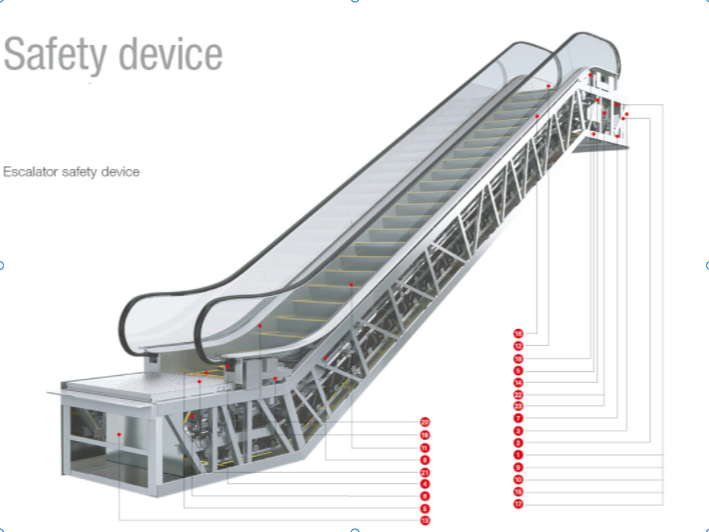 The system integrates multiple standard safety devices covering key components such as the drive unit, speed control, chains, steps, handrails, and braking system, providing comprehensive protection against operational risks.