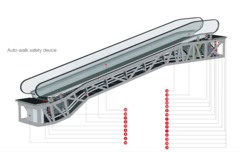 When there is over-speed to the escalator (auto-walk), it will automatically stop the operation.