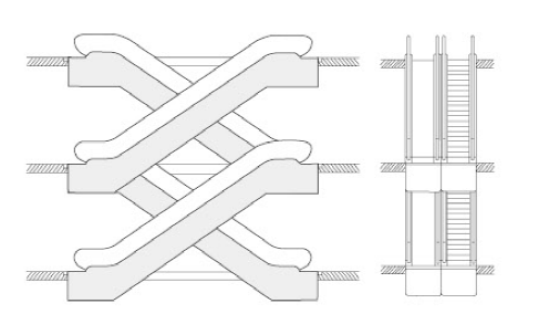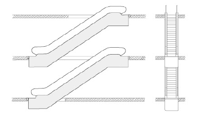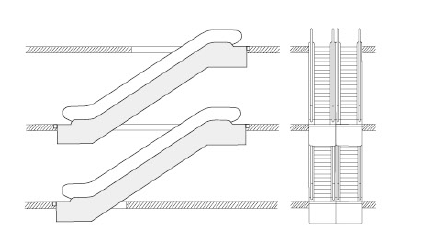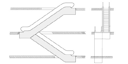 Mainly used in department stores and public buildings with a heavy traffic flow,When there are three or more escalators,the possibility to reverse the direction of travelof both escalators depending on the usage or traffic flow,this arrangement is economical,since no decorative truss cladding required.